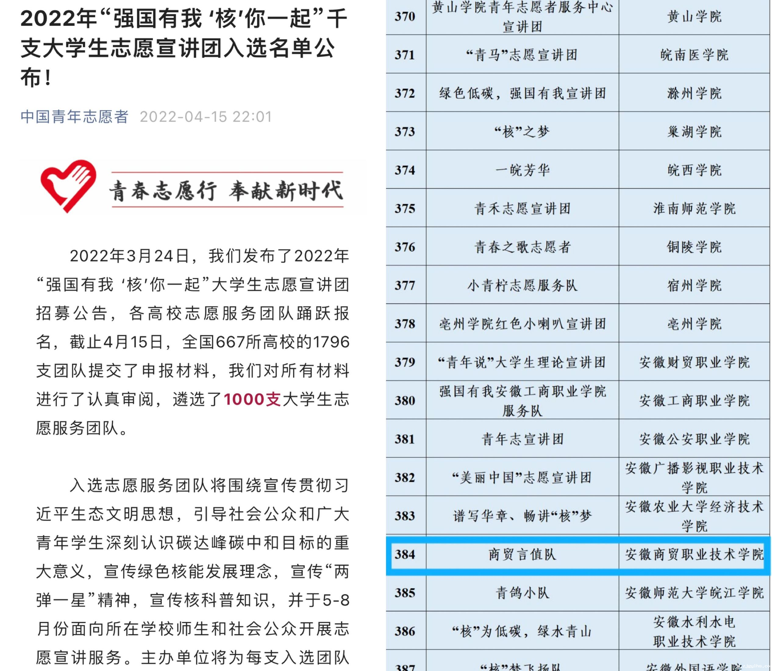 近日,团中央青年志愿者行动指导中心、中国核工业集团有限公司、中国青年志愿者协会秘书处联合开展的“强国有我 ‘核’你一起”大学生志愿宣讲活动入选名单揭晓,我校“商贸言值队”宣讲团从全国1796支团队中脱颖而出,成功入选。
